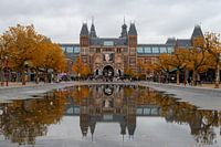 Dit werk toont het Rijksmuseum in Amsterdam, gezien vanaf het Museumplein. Op de voorgrond ligt een grote plas regenwater waarin het Rijksmuseum fraai weerspiegelt.
