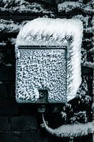 Een met rijmijs bedekt metalen kastje tekent kristallijne patronen tegen een donkere bakstenen muur. Koele blauwgroene tonen en scherpe texturen maken van dit winterse detail een grafische, minimalistische print. Ideaal als wanddecoratie voor moderne interieurs, lofts en creatieve studio’s—perfect voor liefhebbers van industriële esthetiek en winterfotografie.