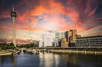 Rijn en Media Haven in Düsseldorf met Rijn Toren en Gerhy Gebouwen met Avondgloed