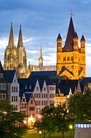 Huizen aan de Rijnpromenade, de Dom van Keulen en de kerk Groß St. Martin bei Nacht, Keulen, Noordrijn-Westfalen, Duitsland.