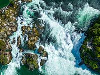 Rijnwaterval in Schaffhausen, Zwitserland van bovenaf gezien. De Rheinfall in de Rijn is de krachtigste waterval van Europa. De positie direct van boven toont het water dat over de rotsen stroomt.