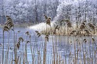 Een winterwonderland zonder sneeuw. Deze rietpluimen, en de bomen op de achtergrond, zijn bedekt met een dun laagje rijp. De foto is gemaakt bij de Tenellaplas, met ijs bedekt, in de duinen van Voorne.