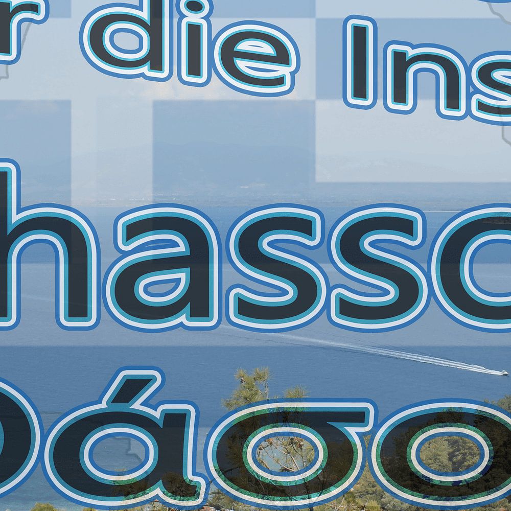 Op de voorgrond leidt een gebogen zwarte tekst met een witte en blauwe rand de kijker door de emoties: "I'm ready for the island". De vetgedrukte tekst in zwart met een witte en blauwe rand verkondigt trots de naam van het eiland in het Duits en in het Griekse schrift - "Thassos - Θάσος". De zwarte tekst met een witte en blauwe rand vervolgt aan de onderkant: "I'm coming". Een belofte die de verwachting van de volgende reis wekt.