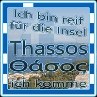 Op de voorgrond leidt een gebogen zwarte tekst met een witte en blauwe rand de kijker door de emoties: "I'm ready for the island". De vetgedrukte tekst in zwart met een witte en blauwe rand verkondigt trots de naam van het eiland in het Duits en in het Griekse schrift - "Thassos - Θάσος". De zwarte tekst met een witte en blauwe rand vervolgt aan de onderkant: "I'm coming". Een belofte die de verwachting van de volgende reis wekt.