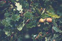 Close-up van takken aan een boom met groene bladeren die langzaam verkleuren in herfstkleuren. Rijpe bruine vruchten van een eikenboom tussen de eikenbladeren van een grote eik in het bos. Eikels tussen het groen in het najaar seizoen.