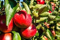 Rijpe dessertappels Jona Gold met groene bladeren aan de boom