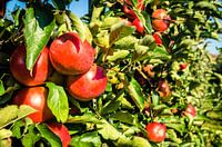 Rijpe dessertappels Jona Gold met groene bladeren aan de boom