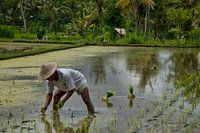 Rijst wordt op een veldje verbouwt wat omgeven is door een dijkje, een sawah of padie. Voor het planten wordt het veldje onder water gezet, zodat de bodem modderig is. De boer maakt een gaatje in de grond en planten daar dan drie jonge rijstplantjes in, Elke keer dat ze dus planten moeten ze diep voorover buigen.