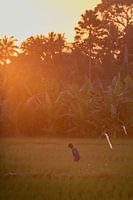 Het mooiste licht om foto's te maken is toch wel in de morgen of tegen de avond. Deze rijstboer werkte dan ook vrolijk door totdat de zon helemaal onder was. De foto is gemaakt in de rijstvelden van Ubud in Bali.