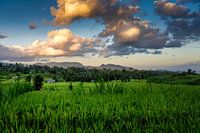 De ondergaande zon verlicht de wolken die langzaam boven een rijstveld in Bali voorbij komen drijven. De rijst is al behoorlijk gegroeid. De rijstkorrels zijn al aan de stelen zichtbaar.
