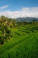 Rijstveld in Jatiluwih op het eiland Bali van Indonesië. Groene velden, blauwe lucht, witte wolken, palmbomen en vulkaan of berg op de achtergrond.