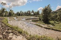 Rijstveld omringd door palmbomen in Azië.