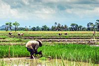Rijstveld met landbouwer die rijst oogst in Bali Indonesië