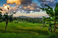 Deze Balinese rijstvelden worden geflankeerd door palmbomen, met een mooi zicht op de bergen in de achtergrond. De ondergaande zon verlicht de wolken van onderen waardoor een mooie warme gloed ontstaat.