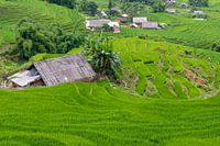Terrassen met rijstvelden en woningen in de bergen in noord Vietnam.
