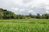 Weg tussen de fel groene velden in de buurt van Ubud op het eiland Bali in Indonesië tijdens een bewolkte dag in het regenseizoen.