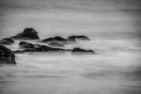 Een met mosselen begroeide golfbreker komen langzaam aan de oppervlakte op weg naar laag tij . De combinatie van de golven met een langere sluitertijd geven het een impressionistisch uitzicht