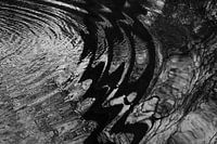 Rimpelingen in het water geven mooie cirkelvormen vanaf de linkerkant. In het water zie je de bomen gespiegeld. Zwart-wit-opname.