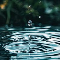 Centrale druppel hangt boven het wateroppervlak. Rustige blauwe tinten met subtiele reflecties. Harmonisch en meditatief, ideaal voor een muurdecoratie. Het toont een moment van serene stilte en natuurlijke elegantie.