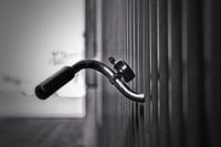 Detailopname van een deel van een fietsstuur met fietsbel. Beide steken uit door de tralies van een fietsenstalling.