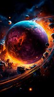 Genesis van de planeet. Een enorme, vurige oranje en paarse planeet omringd door een dramatische ring van puin en kosmisch stof. Intense gravitatiekrachten geven vorm aan de vurige diepe ruimte.