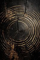 Indrukwekkende close-up van een boomstam met zijn jaarringen duidelijk zichtbaar. De concentrische ringen, zorgvuldig geëtst in het donkere hout, vertellen het verhaal van de tijd die voorbij is gegaan. De diepe scheuren die vanuit het midden van de jaarringen stralen, suggereren een lange geschiedenis en misschien zelfs een trauma dat de boom heeft meegemaakt tijdens zijn leven. Het contrast tussen de warme, goudachtige tonen van de jaarringen en het donkere, bijna zwarte hout geeft het werk een gevoel van diepte en rijkdom.