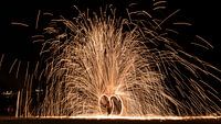 Een energiek spetterend vuurwerk met 2 rondslingerende potten geeft een feest van warmte, licht en vuur, Een mooi tafereel met twee ringen van vuur, die als verbondenheid, trouwringen of als een hartje gezien kunnen worden