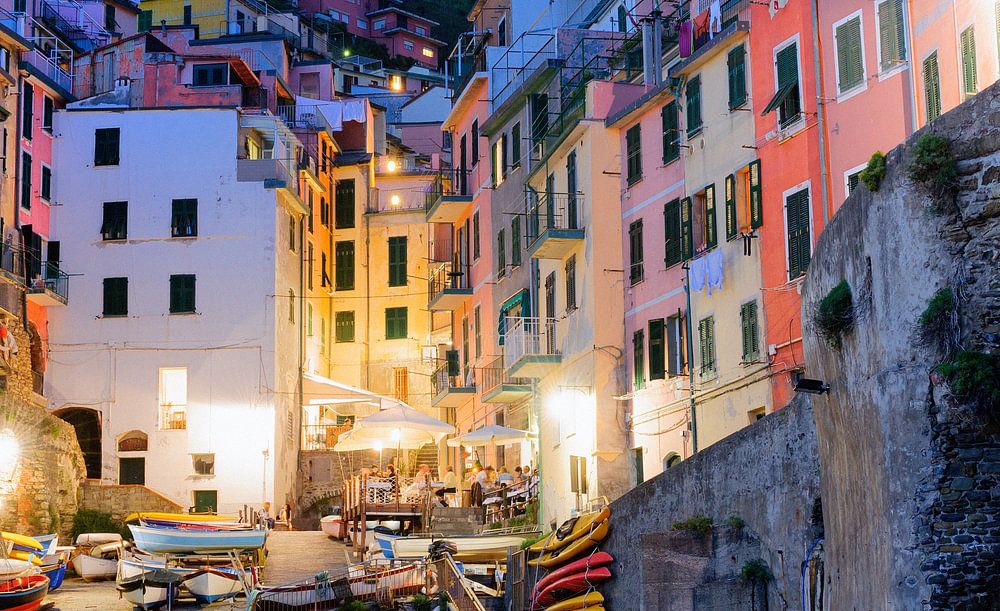 Riomagiorre,Ligurie,Italie, mensen eten op een zomeravond buiten in dit vissersdorp in cinque terre.
