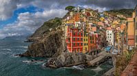 Een groothoekopname van Riomaggiore in Cinqe Terre. De zon schijnt mooi de haven van het dorp binnen.