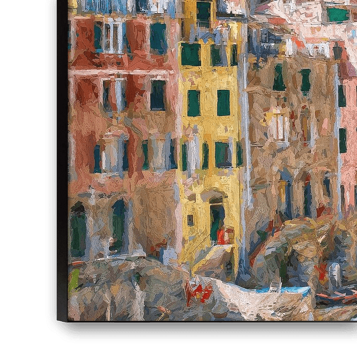 De haven van Riomagiore in Cinqueterre aan de Italiaanse kust als schilderijRiomaggiore is het meest zuidelijke dorp van de Cinque Terre, op slechts een paar minuten met de trein van La Spezia. De stad klimt omhoog langs de bergkammen met uitzicht op de zee en wordt gekenmerkt door de typische stenen huizen met gekleurde gevels en leien daken.