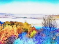 Een fotokunst wintergezicht in Umbrië, Italië. Lage bewolking in het dal beneden, maar de zon begint net de glorieuze late 'herfstkleur' op de voorgrond te benadrukken. Het donkere skelet van een boom die zijn bladeren al heeft verloren, ook op de voorgrond, vormt een opvallend contrast met de mist daarachter. Boven het dal zijn de…