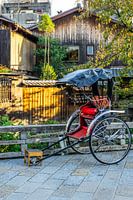 Risksja tijdens een zonnige herfst dag in de wijk Gion in het centrum van Kyoto in Japan. Tijdens de avond.