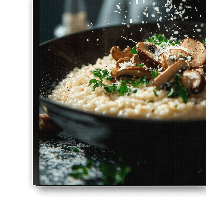 De hartige smaak van vers bereide risotto, afgewerkt met een perfect snufje Parmezaan, straalt puur genot uit. De harmonieuze samenstelling van romige rijst en delicate paddenstoelen belooft een streling voor het gehemelte. Deze levendige presentatie is ideaal voor in de keuken, waar het culinaire inspiratie en warmte uitstraalt.