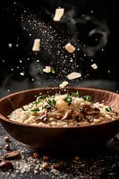 In een houten schaal ontvouwt zich een smaakvol meesterwerk: romige risotto, gegarneerd met verse kruiden en vliegende stukjes kaas, gehuld in een mysterieuze stoomwolk. Dit verleidelijke kunstwerk is de perfecte blikvanger voor in de keuken, waar elke maaltijd een culinaire belevenis wordt.