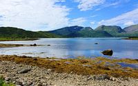 Blick auf die Landschaft am Risøysundet/Buknesfjorden und die Berge auf der Insel Andøya mit der Ortschaft Skjoldehamn. Vesterålen, Nordland, Norwegen im Juli 2016.