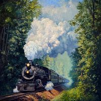 Een imposante stoomlocomotief baant zich een weg door een groen paradijs, terwijl witte stoomwolken majestueus opstijgen naar de blauwe hemel. Omringd door dichte bomen die de vrijheid van de natuur belichamen, belooft deze nostalgische trein een avontuur dat je meeneemt naar lang vervlogen tijden. Een harmonieus contrast van technologie en wildernis ontvouwt zich!