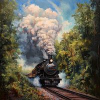 Een imposante stoomlocomotief baant zich een weg door een groen paradijs, terwijl witte stoomwolken majestueus opstijgen naar de blauwe hemel. Omringd door dichte bomen die de vrijheid van de natuur belichamen, belooft deze nostalgische trein een avontuur dat je meeneemt naar lang vervlogen tijden. Een harmonieus contrast van technologie en wildernis ontvouwt zich!