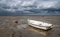 Een vissersbootje op het slik van de Oosterschelde wordt gevangen in het zachte licht van de zon die het net even oplicht te midden in een achtergrond van donkere, dreigende wolken.