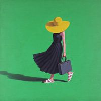 Het schilderij verbeeldt een vluchtig, contemplatief moment binnen het ritme van het stadsleven. Een eenzame vrouw beweegt zich gracieus over een groene vlakte met textuur. Haar breedgerande gele hoed steekt fel af tegen de achtergrond en verovert het oog en het hart van de kijker. De hoed is niet zomaar een accessoire; het is een gedurfde verklaring van individualiteit tegen de achtergrond van routine.