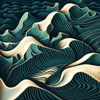 "Rhythms of Sand and Sea" toont een abstract landschap gedefinieerd door vloeiende, wervelende lijnen en rondingen die doen denken aan de beweging van verschuivende duinen of rollende golven. De harmonieuze mix van blauwgroene en crèmekleurige kleuren creëert een indrukwekkende diepte en contrast, waardoor het werk een dynamische maar rustgevende uitstraling krijgt - ideaal om verfijning en energie toe te voegen aan elke omgeving.