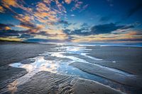 Een magisch momentje op de Noordzee stranden van het Waddeneiland Texel. De dynamiek van de lucht en patronen op het strand lijken samen te komen en elkaar te versterken in deze compositie. Een sfeervolle zonsondergang aan de Hollandse kust met een heerlijke dieptewerking