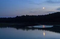 Prachtige donkere nacht opname van een landschap met een bos en een halve maan na zonsondergang aan rivier de arguenon bij Saint-Malo in Bretagne, Frankrijk in de zomer