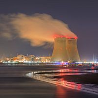 scène van de nacht met een geweldig uitzicht op de rivier met verlichte kernreactor Doel, Haven van Antwerpen