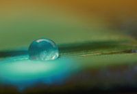 Macrofotografie in diverse groentinten met een beetje blauw en bruintinten. Waterdruppel.