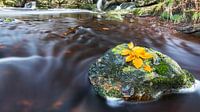 Steen in een beek met herft blad.
