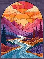 Een levendige en fascinerende digitale illustratie, die doet denken aan klassieke glas-in-loodkunst, toont een sereen landschap bij zonsondergang. Het ontwerp toont een kronkelende rivier die door gestileerde bergen stroomt, geflankeerd door groenblijvende bomen, allemaal badend in de warme gloed van een ondergaande zon. Het rijke kleurenpalet en de gedurfde contouren creëren een visueel boeiend stuk, perfect om een vleugje artistieke elegantie toe te voegen aan een verscheidenheid aan projecten.