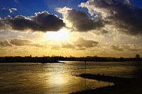 Laagstaande zon schijnt over de Lek nabij Vianen. Foto is genomen vanaf de Lekdijk te Nieuwegein