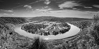 Een 2:1 panorama beeld in Zwart-Wit van een bocht in de rivier de Moezel met uitzicht op de plaatsen Kröv en Wolf (Traben-Trarbach) in de deelstaat Rijnland-Palts in het westen van Duitsland.