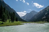 Rivier die tussen door de bergen stroomt in de Tian Shan bergen in Kirgizië. Blauwe lucht en het water kleurt blauw grijs door het sediment.