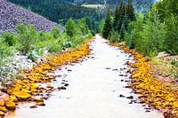 Het gesteente aan de oevers van de rivier zijn oranje/geel gekleurd. De omgeving staat vol verschillende groene bomen in het zomerseizoen.
